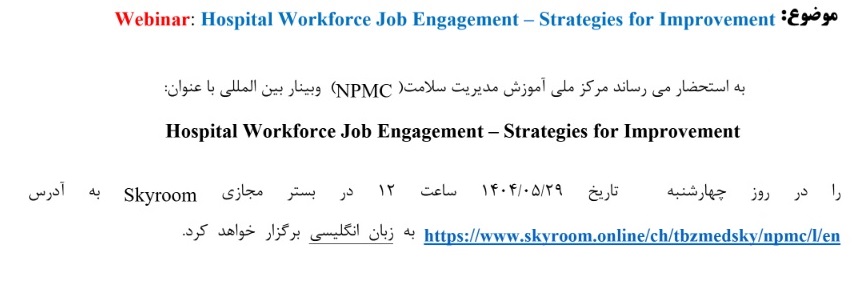 وبینار آموزشی بین المللی Hospital Workforce Job Engagement – Strategies for Improvement ۲۹ مرداد ۱۴۰۴ | ۱۰:۰۱ کد : ۵۳۹۲۵ اطلاعیه ارسال به دیگران نام شما ایمیل شما ایمیل دریافتکننده ارسال انصراف تعداد بازدید:۱۱۰۳ وبینار آموزشی بین المللی Hospital Workforce Job Engagement – Strategies for Improvement