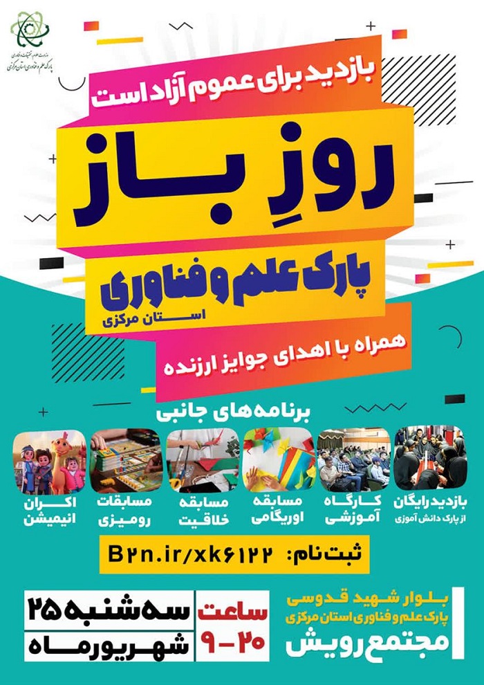به اطلاع می رساند پارک علم و فناوری استان مرکزی در راستای ایفای رسالت ترویجی خود و به منظور ارتقای آگاهی عمومی نسبت به ظرفیت ها، توانمندی ها و زیرساخت های پارک علم و فناوری استان، اقدام به برگزاری رویدادی تحت عنوان " روز باز پارک علم و فناوری " نموده است.
