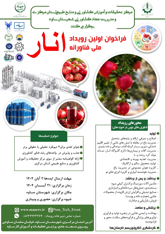 مرکز تحقیقات و آموزش کشاورزی و منابع طبیعی استان مرکزی و مدیریت جهاد کشاورزی ساوه، اولین رویداد ملی فناورانه انار را برگزار می نمایند.